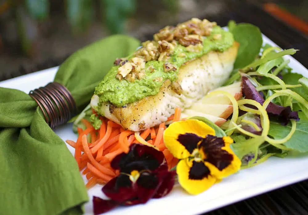 - Place a fillet on each plate, drizzle with lemon and spread the pesto on top (about 2 tablespoons per dish).