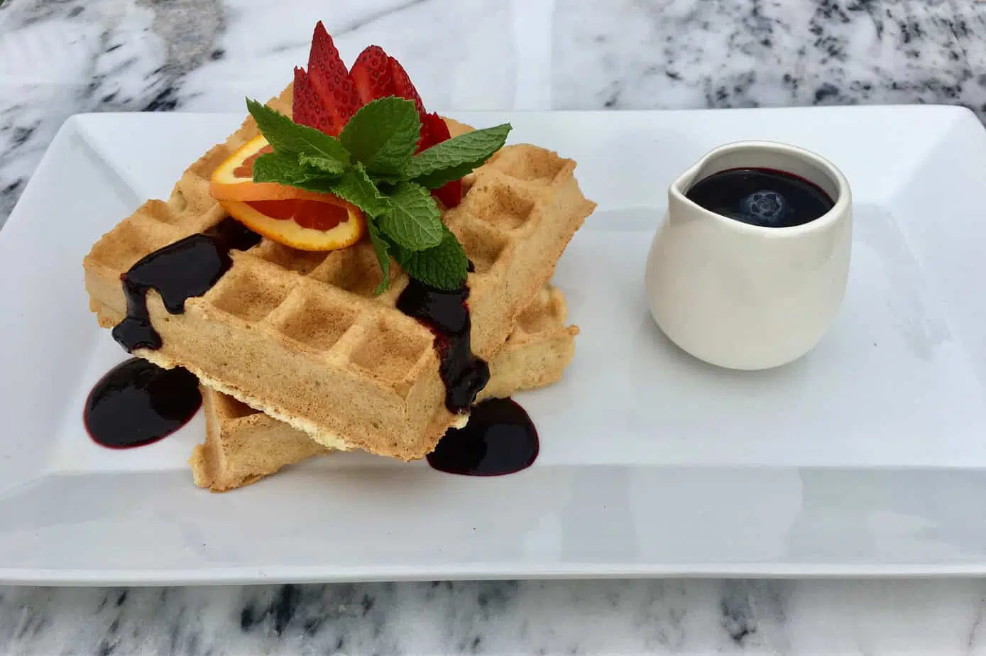 Additions for sweet waffles include: cinnamon, nutmeg, pumpkin spice, cloves, vanilla, lemon zest, minced fresh mint, minced berries, chopped nuts, and mini stevia-sweetened chocolate chips.