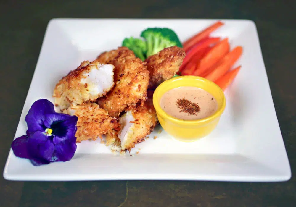 - Gently place fish sticks in coconut flour, lightly dusting on all sides.