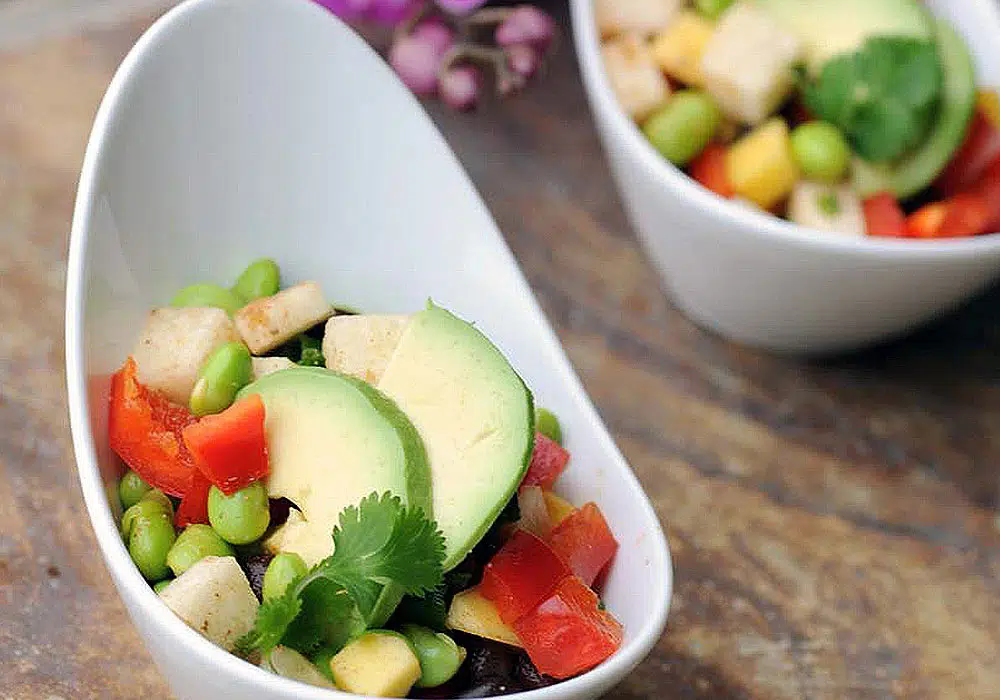 - Mix edamame, beans, jicama, mango, scallions, bell peppers, and cilantro together in a large bowl.
