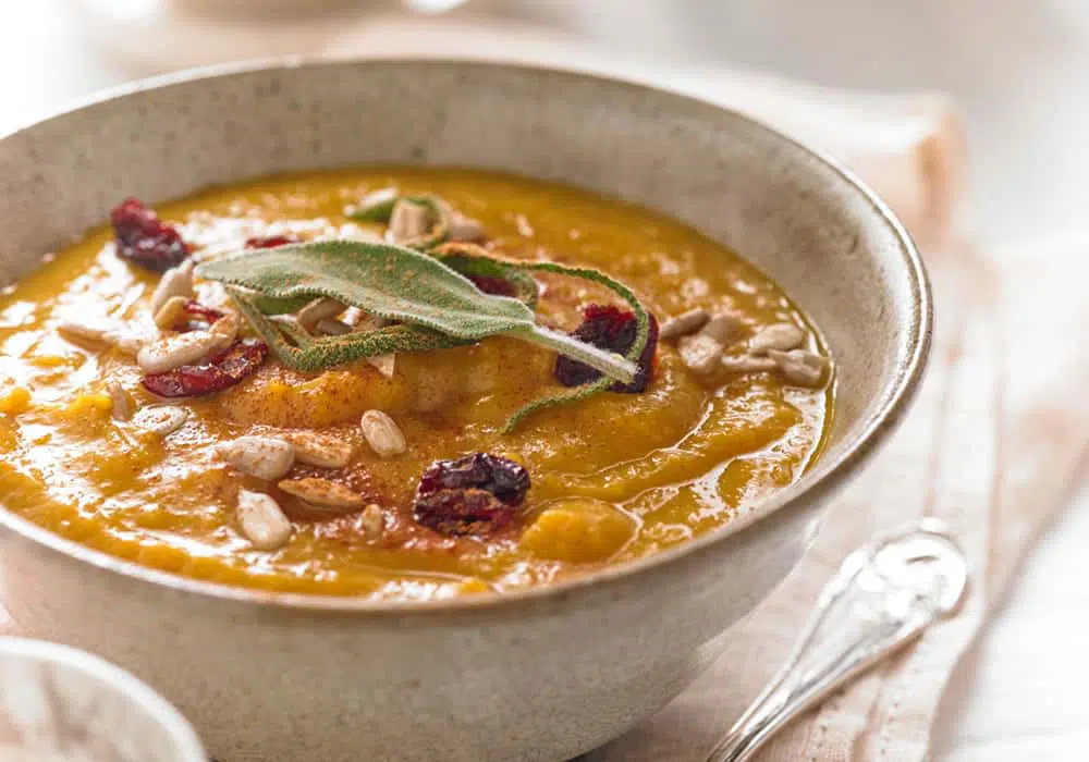 - Ladel soup into bowls. Sprinkle sunflower seeds, sage, and cranberries in each bowl and serve. Garnish and serve with cinnamon.